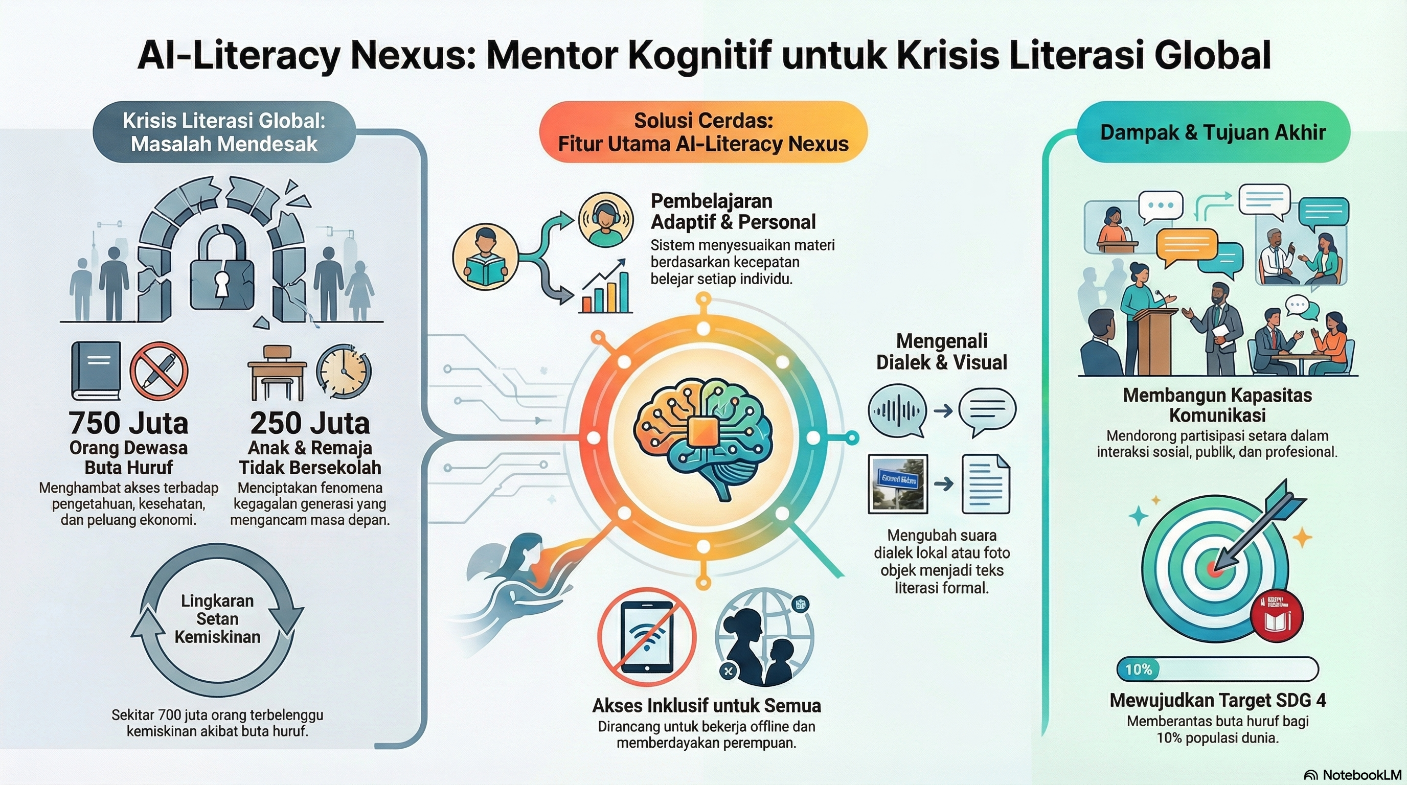 AI-Literacy Nexus bukan sekadar produk teknologi, melainkan instrumen untuk mencapai target SDG 4: Quality Education. Dengan menghapus buta huruf bagi 10% populasi dunia, inovasi ini memberikan kunci bagi umat manusia untuk membuka pintu kesehatan, martabat ekonomi, dan masa depan yang lebih adil. Produk ini memastikan bahwa setiap manusia, dari wilayah terpencil hingga zona konflik, dapat menjadi “Protagonis-Penulis” dalam narasi kemajuan kolektif umat manusia.
